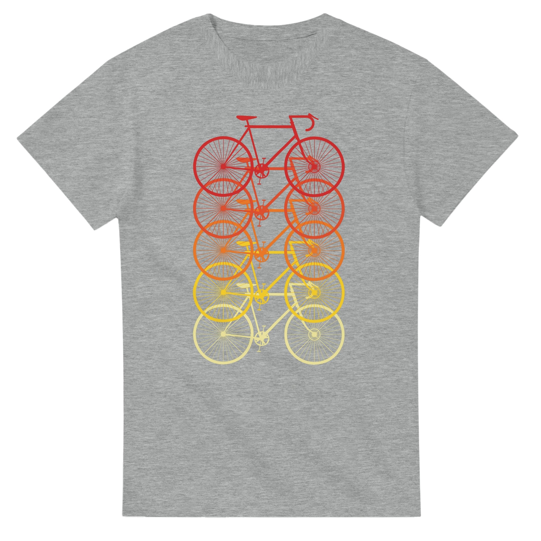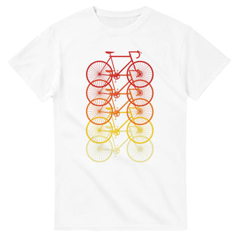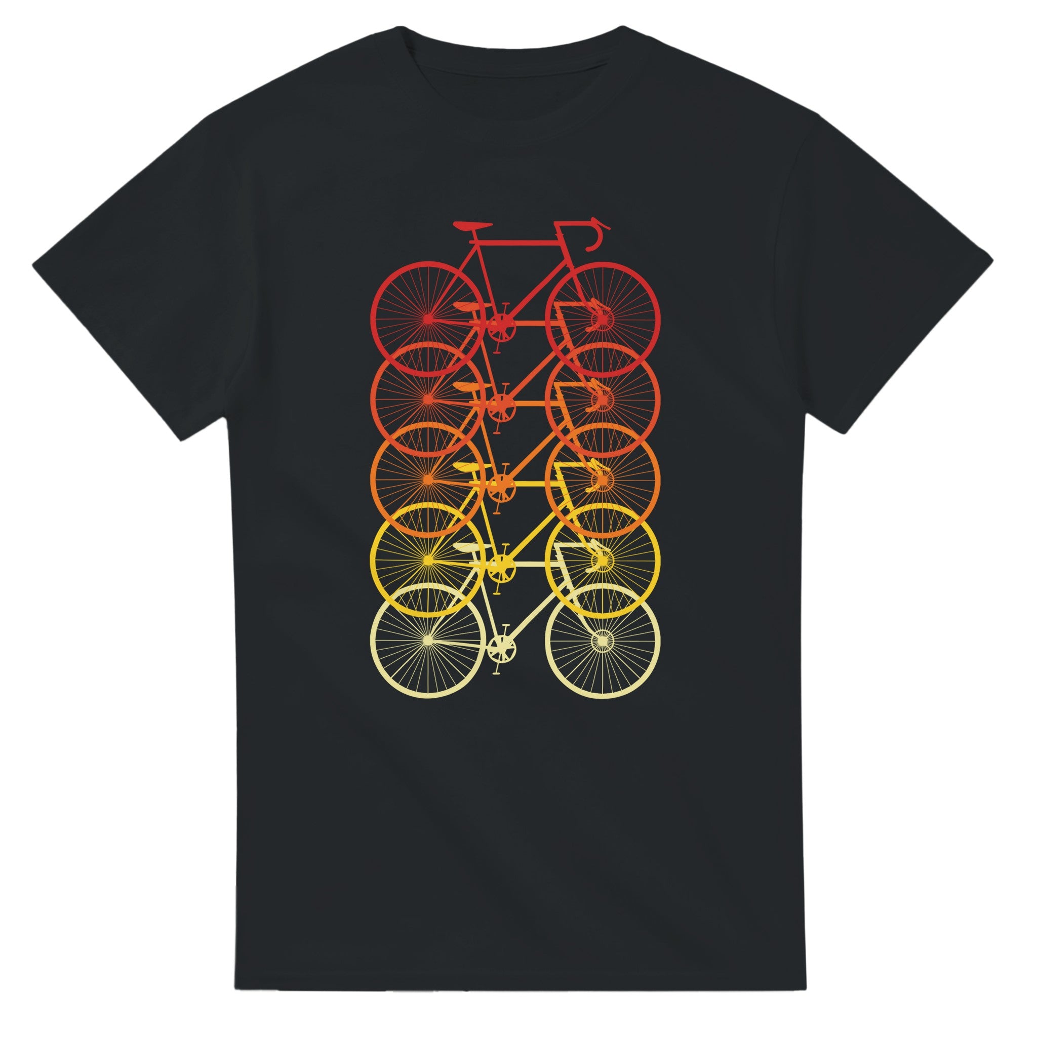 A vibrant and artistic design featuring a row of stylized bicycles in warm gradient shades from deep red to yellow. This t-shirt is perfect for cycling enthusiasts who love both aesthetics and adventure on two wheels. It represents the ideal combination of style and passion.