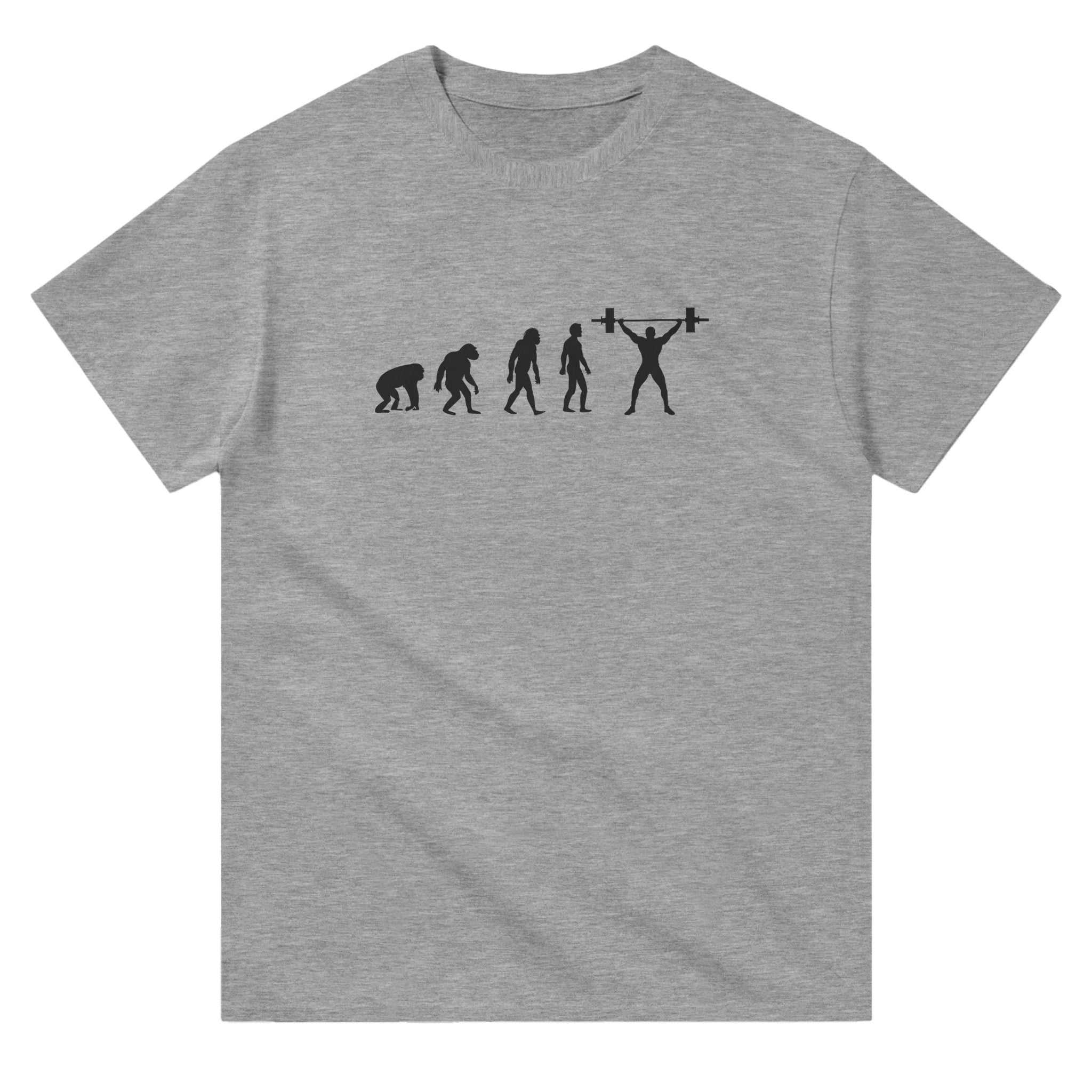 • Challenging and Funny Design: A creative illustration showing the steps of evolution, culminating in a strong bodybuilder lifting a weight overhead, ideal for eliciting smiles and attention.