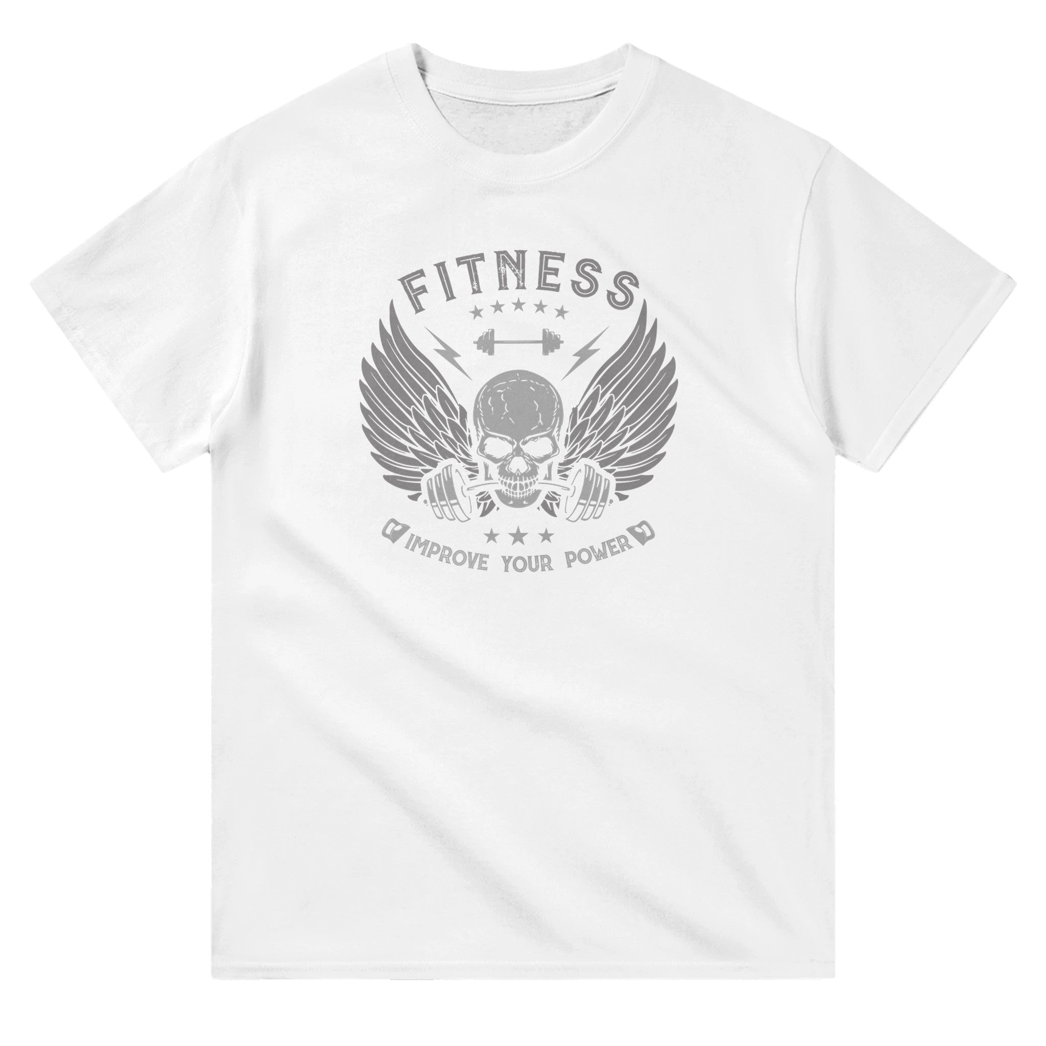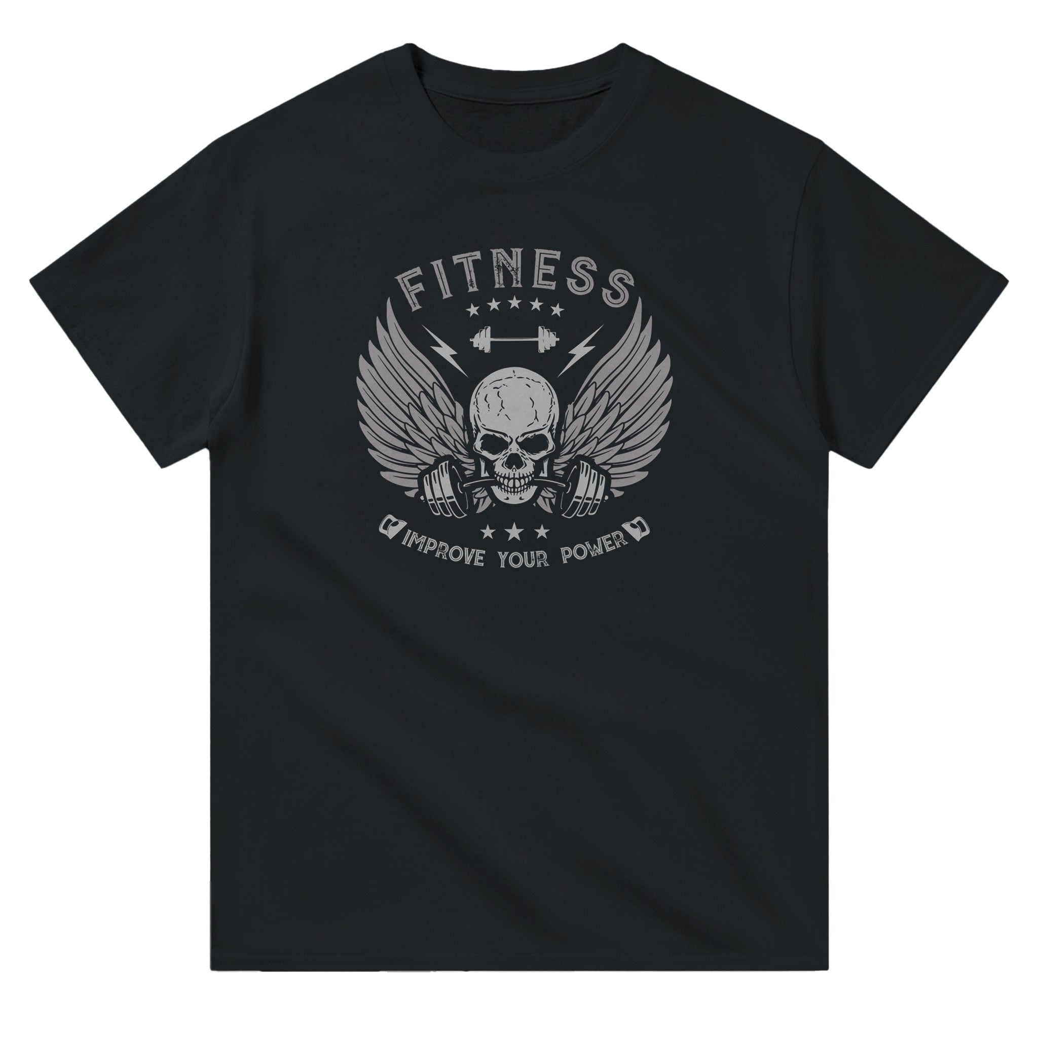 Motivational Message: The text "FITNESS" written in big, bold letters at the top, together with "IMPROVE YOUR POWER" at the bottom, reinforce the central message of the design: the constant improvement of physical and mental strength through hard work and perseverance.