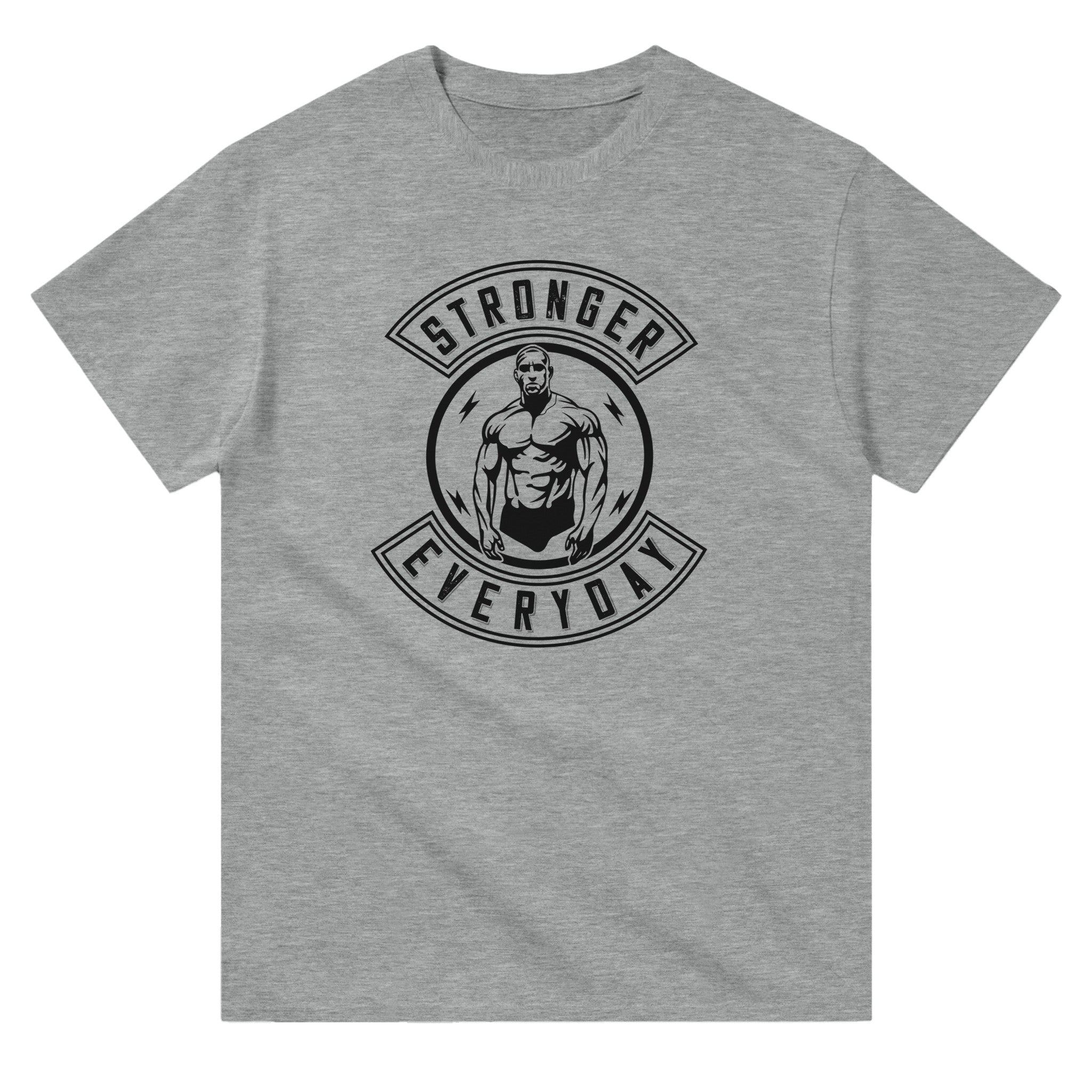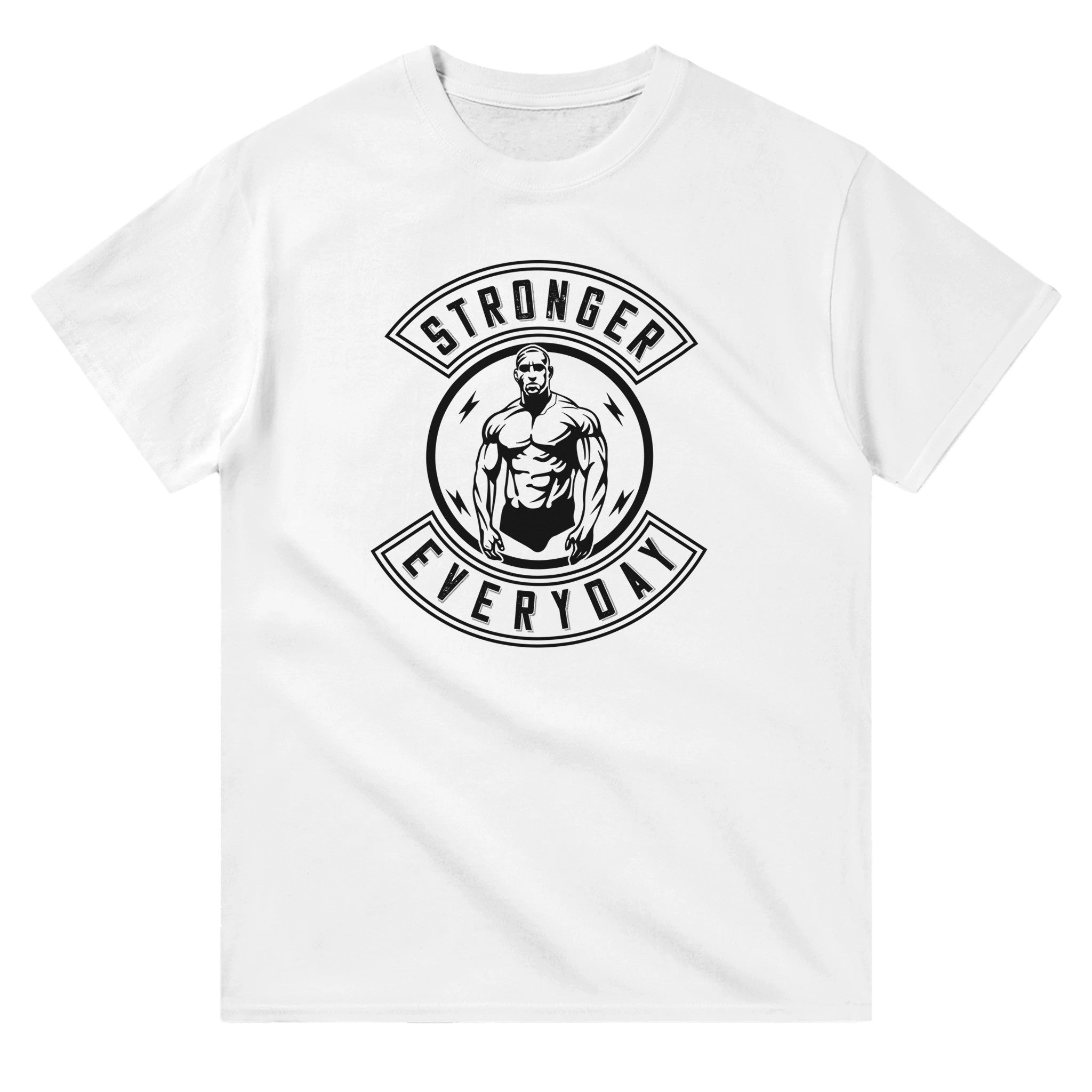 • "Stronger Everyday" text: This is the key message of the design, placed visibly below the bodybuilder. The phrase "Stronger Everyday" represents the continuous progress and constant effort put into each workout. The message inspires perseverance and determination, reminding you that every day counts.