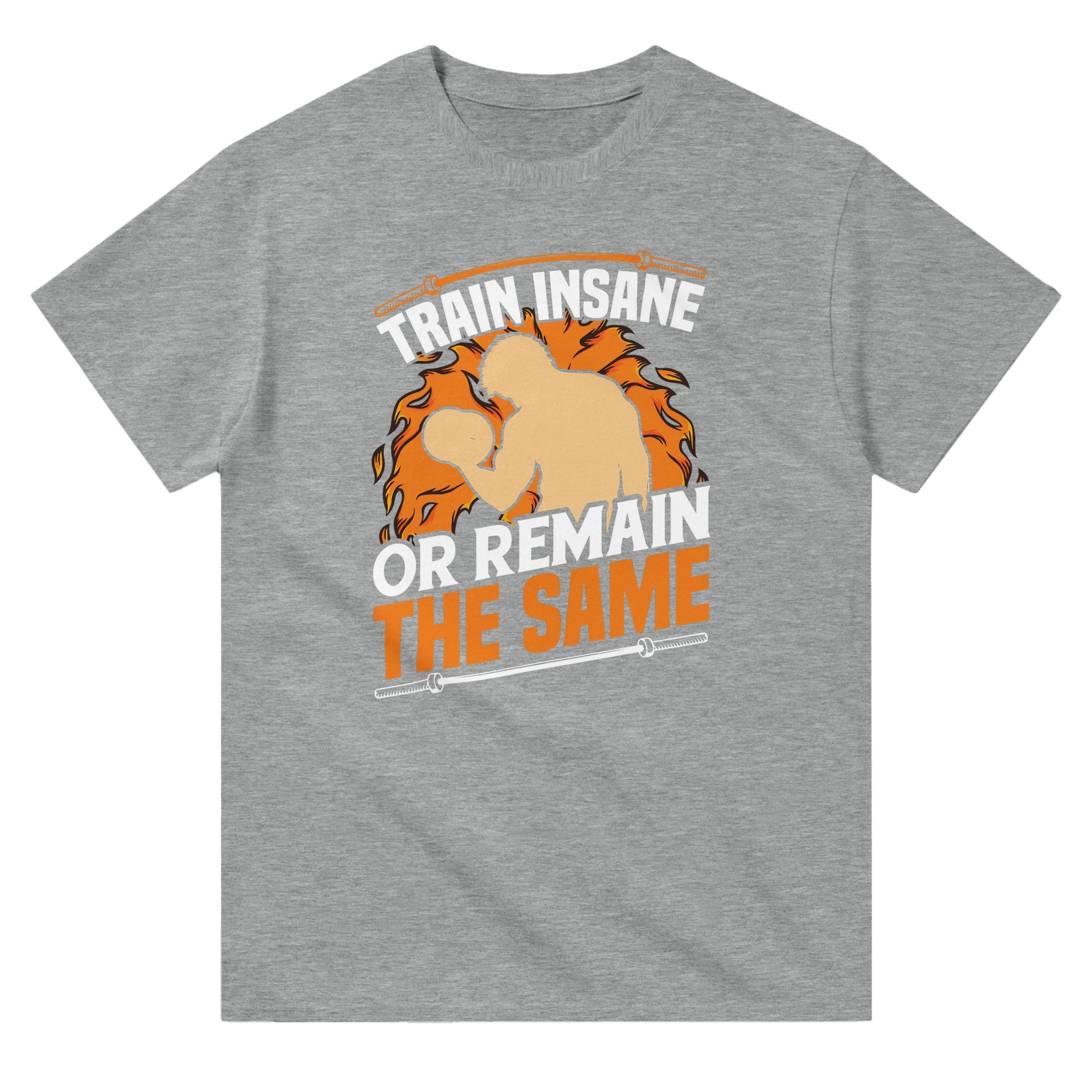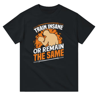 Central Text: "TRAIN INSANE OR REMAIN THE SAME" is written in large, white and bold letters, being the focal point of the design. The message is direct and powerful, urging you to push your limits and train hard.