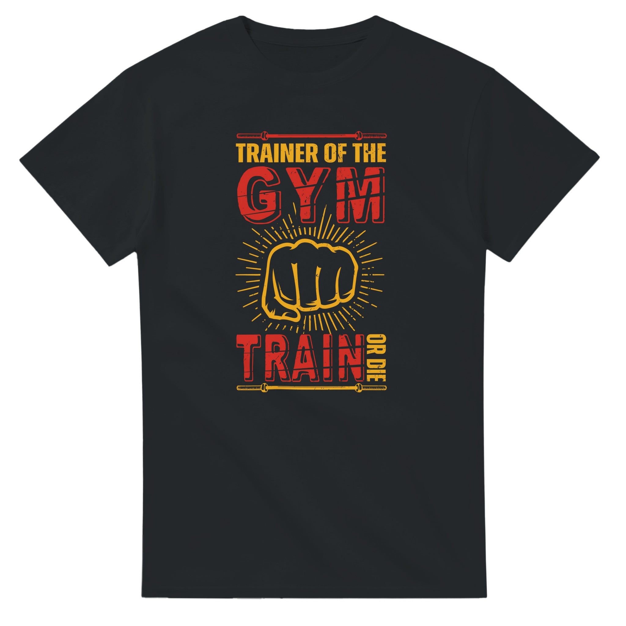 A t-shirt dedicated to those who dominate the gym and inspire those around them to push themselves to their limits. Its striking design, with the motivational messages "Trainer of the Gym" and "Train or Die" , along with the powerful symbol of a fist, reflects the invincible mentality of those who live for fitness.